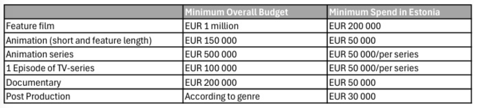 The level of support is determined by amount of the Estonian production costs that are both eligible and directly spent on parties that are subject to Estonian taxation, multiplied by 30% or 40%.